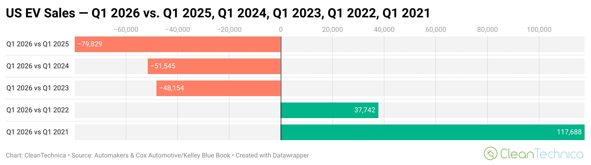 When Joe Biden and Democrats received management of the White Home and Congress, they revived and prolonged the $7,500 EV tax credit score, with some new stipulations but additionally very inclusive loopholes. Briefly, Individuals had been incentivized to purchase extra new EVs. Then, Donald Trump and Republicans took over and killed these EV incentives. Q1 2026 US EV gross sales in comparison with earlier years, we are able to now get a way of the impact this has had available on the market.